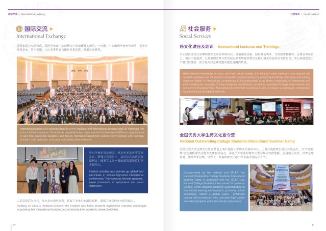 Standing in the forefront of intercultural research in China, SII has made remarkable achievements. It also has built a comprehensive curriculum for undergraduate, graduate, and doctoral students, and published a series of IC textbooks that provides an innovative approach to IC education. With pioneering research into IC, the institute has published Intercultural Research which focus on cutting-edge research on the intercultural field in a variety of areas and provided academic support for SFLEP Cup National College Students’ Intercultural Competence Contest (SNICC). And it’s MOOC course - “Intercultural Communication” - has been selected as one of the country’s first model MOOCs and won the first prize for Shanghai Teaching Achievement Award in 2018.